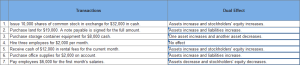 For the first month of operations, the company had the following transactions. For each transaction, describe the dual effect on the accounting equation. For example, in the first transaction, (1) assets increase and (2) stockholders’ equity increases.