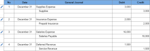 Show the adjusting entries that were made for supplies, … insurance, salaries payable, and … revenue on December 31. (If no entry is required for a particular transaction/event, select “No Journal Entry …” in the first account field.)