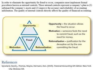 What is meant by the fraud triangle, and what can companies do to help prevent fraud? Please refer to the textbook for your response. At least one of the three elements of the fraud triangle must be eliminated. Of the three elements, companies have the greatest ability to eliminate opportunity.