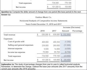 1. Question: The comparative income statements of Outdoor Music Co. follow: Calculate the change in the income statement amounts from 2017to 2018.(Use a minus sign or parentheses for a)