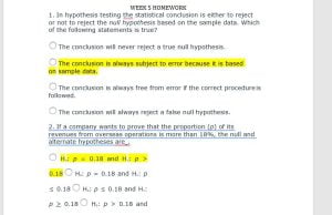 - Question: In hypothesis testing the statistical conclusion is either to reject or not to reject the null hypothesis … on the sample data. Which of the following statements is true?