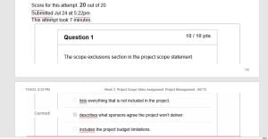 Watch a video recording on the Project Scope Statement (https://share.percipio.com/cd/NpIAeLcnog) (4m 56s) video and answer the assignment questions. The assignment has two multiple choice questions. Each question might have multiple answers. The assignment can be taken twice.