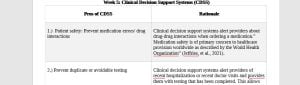 - This week we learned about the potential benefits and drawbacks to clinical decision support systems (CDSSs). Create a “Pros” versus “Cons” table with a column for “Pro” and a separate column for “Con”. Include at least 3 items for each column. Next to each item, provide a brief rationale as to why you included it on the respective list.