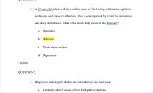 - Question: A 72 year old patient exhibits sudden onset of fluctuating restlessness, agitation, confusion, and impaired attention. This is accompanied by visual hallucinations and sleep disturbance. What is the most likely cause of this behavior?
