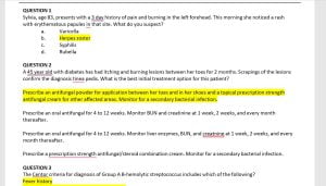 1.Question: A 19 year old basketball player complains of itching in the crural folds, buttocks, and upper thighs. The lesions are well demarcated and are half-moon shaped. The area is red, irritated, and there are small breaks in the skin from scratching. What is this patient’s diagnosis and how should it be treated?