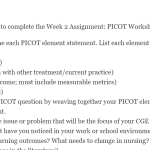 Use the PICOT worksheet to complete the Week 2 Assignment: PICOT Worksheet.Step 1: Clearly define each PICOT element statement. List each element:P (population)