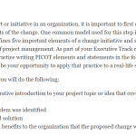 In leading a change effort or initiative in an organization, it is important to first crystalize your thoughts about important elements of the change. One common model used for this step is known as PICOT. PICOT identifies and defines five important elements of a change initiative and serves as a foundation for the planning phase of project management. As part of your Executive Track courses, you have been gi...