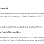 This assignment is a self-assessment of the student's perceived level of competency in areas of leadership deemed important by the American Organization of Nurse Executives (AONE).