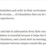 Instructions Young infants need sufficient stimulation and order in their environments to maximize the early period of rapid growth. Give an example of some.... of stimulation that can be used by caregivers to invigorate the brain's ability to respond to experiences.SOLUTION In order to develop their senses and take in information from their surroundings, babies need to be stimulated appropriately. Stimulation is essential because it helps the baby develop motor skills, understandi...