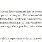 Instructions One of the areas of social and emotional development studied by developmental psychologists is the concept of infant attachment to a parent or caregiver. The process of attachment typically occurs during the 5th to the 9th month of life. Review John Bowlby and Ainsworth's attachment theory. How important is it for infants to form a good attachment to their caregivers? Pick..... of the attachment theories, give an example, and explain a good or a problem that could occur with at...
