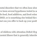 Discussion 1 One of the major developmental disorders that we often hear about is attention deficit hyperactivity disorder (ADHD). There have been several hypotheses tested in search of a cause of ADHD. Factors that have been considered include food, food additives, and food colorants. Is the diet of today's children really creating issues like ADHD, or is something else behind the rapid rise in the number of children being diagnosed with it? What can you offer to back up your position?S...