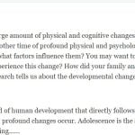 Discussion Topic 1 We have learned about the large amount of physical and cognitive changes that occur during the first year of life. Adolescence is another time of profound physical and psychological change. Specifically, what are these changes, and what factors influence them? You may want to think back on your adolescence. How did you experience this change? How did your family and friends react to them? We will also discuss what the research tells us about the developmental changes of ...